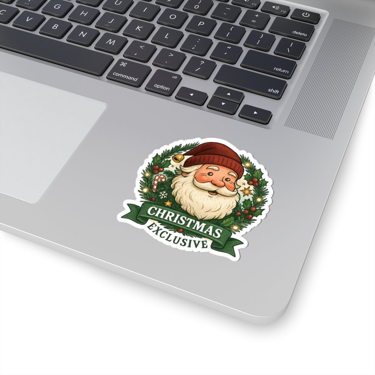 This glossy kiss-cut sticker brings a warm, vintage holiday charm wherever it goes. A smiling Santa peeks through a festive wreath of holly, bells, and candy canes, with a green banner that reads “Christmas Exclusive.” The colors are bright and cheerful thanks to eco-solvent inks on durable vinyl, and the scratch-resistant glossy finish keeps the artwork lively through everyday wear. It applies smoothly and bubble-free to laptops, journals, windows, and more — choose white or transparent backing and four convenient sizes to match your surface. Meant for adult collectors and seasonal decorators who love nostalgic, hand-illustrated holiday style.