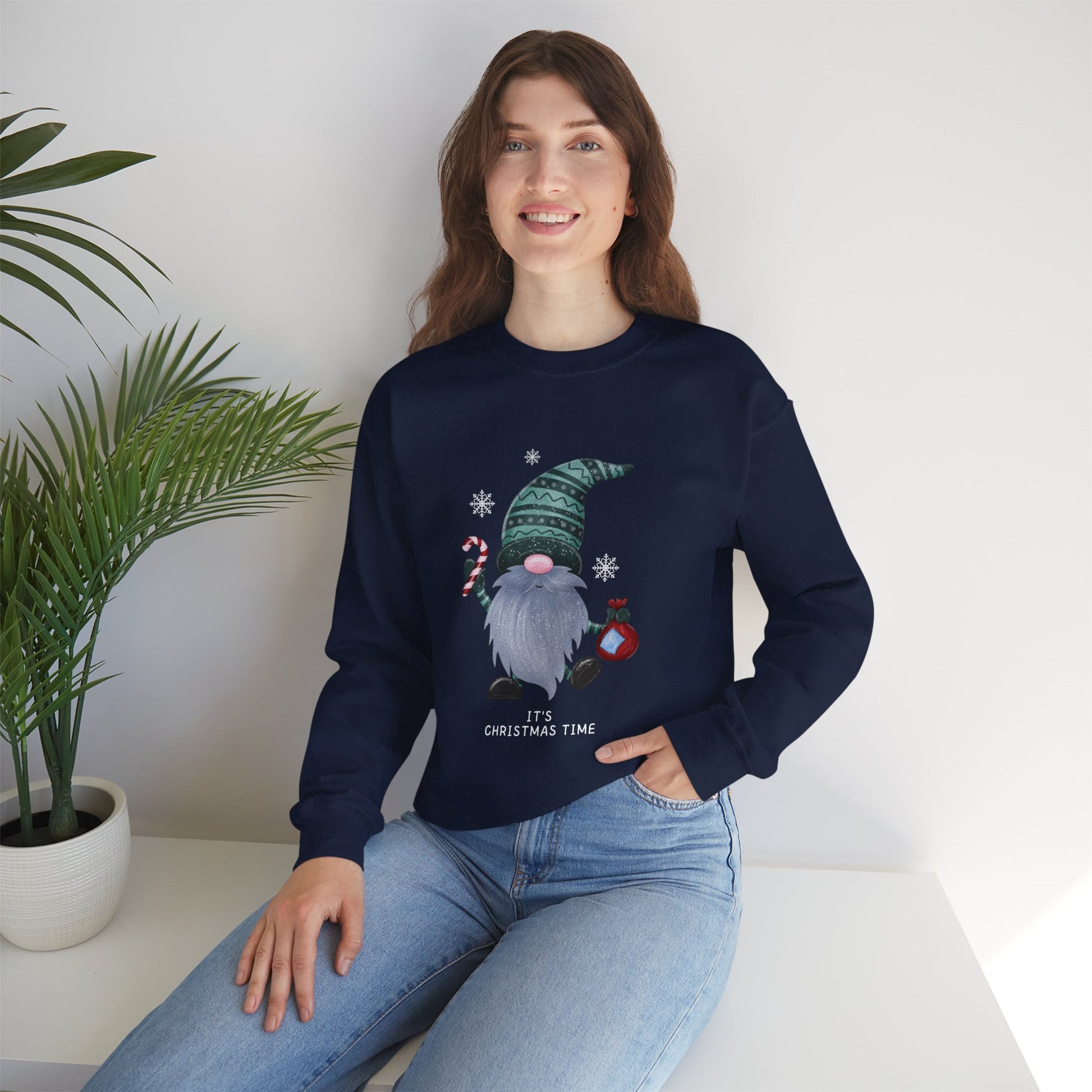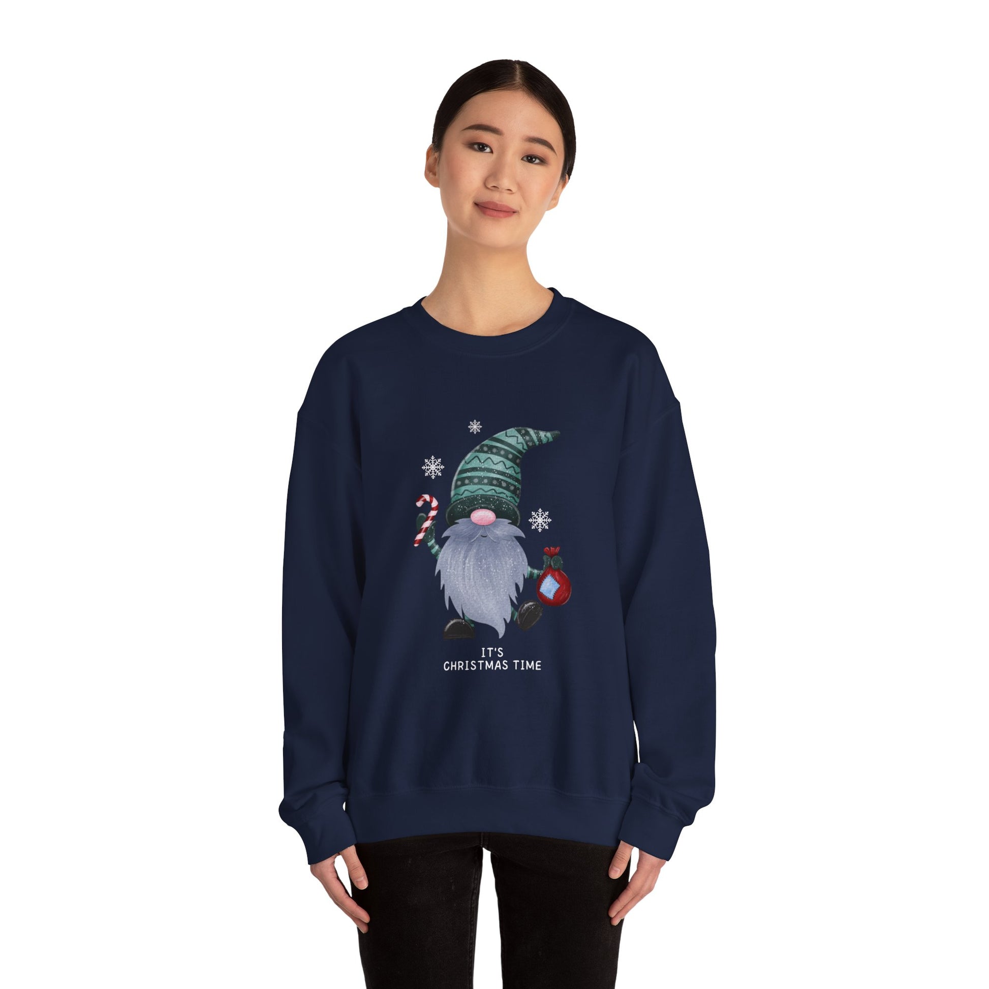 A cozy, forest-green crewneck sweatshirt featuring a whimsical Christmas gnome illustration—striped knit hat, fluffy white beard, candy cane, ornament and falling snowflakes—centered above the text “It’s Christmas Time.” The medium-heavy 50/50 cotton-poly blend offers warmth without weight, while a classic fit and crew neckline keep the silhouette clean and comfortable. Thoughtful construction details—no side seams for a smooth look, ribbed collar and cuffs to hold shape, double-needle stitching for long-lasting wear, and a soft tear-away label—make this sweatshirt easy to wear through holiday gatherings, tree-lighting nights, and slow mornings with cocoa. Sustainable-minded production (US cotton sourcing, OEKO-TEX dyes, safety compliance) adds confidence for shoppers who care about materials and manufacturing. Available with printed inner neck labels and optional embroidery placements if you want to personalize the chest or wrists.