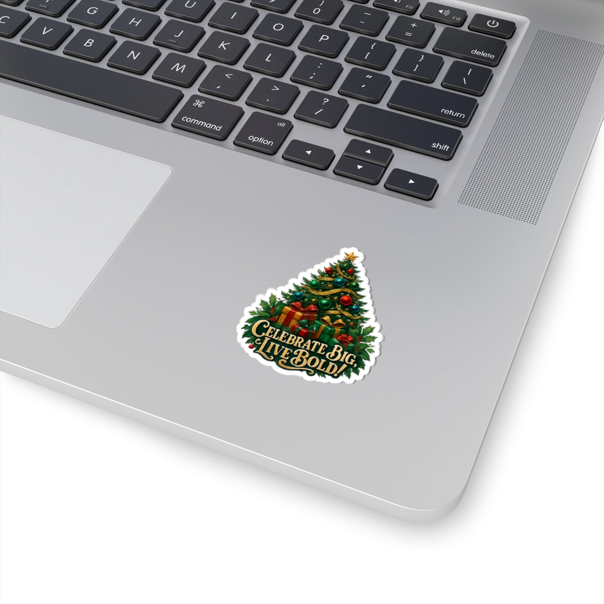 A glossy kiss-cut vinyl sticker featuring a vintage-style Christmas tree piled with wrapped presents and the bold phrase “Celebrate Big, Live Bold!” in ornate lettering. The rich greens, reds, and golds pop with eco-solvent inks on a smooth, scratch-resistant surface. Use it to add festive cheer to laptops, journals, water bottles, or holiday cards. Application is quick and bubble-free, and you can choose white or transparent backing and from four sizes to suit your placement. This sticker brings warm, celebratory energy to holiday décor and seasonal crafting projects.